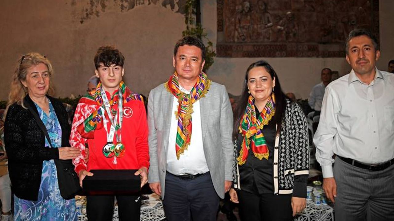 Gecenin sonunda Osmangazi Belediye Başkanı Erkan Aydın ve DAĞDER Genel Başkanı Derya Kaya Başak, Dünya Bilek Güreşi Şampiyonasında Milli formayla mücadele ederek sol kolda tüm rakiplerini eleyip dünya şampiyonu olmayı başaran ve dağ yöresine büyük gurur yaşatan Berat Demir’e plaket vererek tebrik etti.