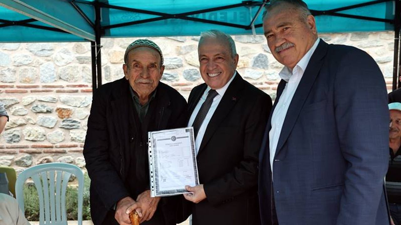 Konuşmaların ardından Başkan Şadi Özdemir ve Ürünlü Mahalle Muhtarı Kadri Beki, vatandaşlara tapularını teslim etti.