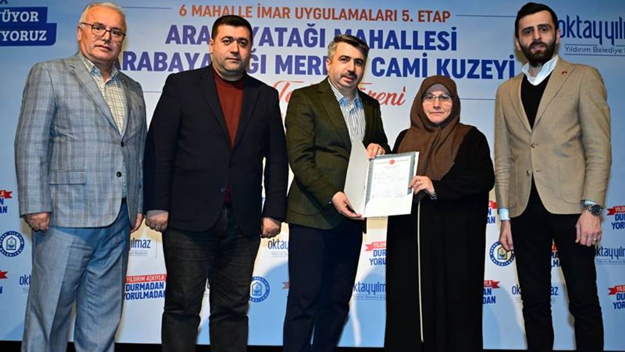 Yıldırım Belediyesi, kentsel dönüşümün temel taşı olan mülkiyet sorunlarını birer birer çözüyor. Arabayatağı, Çınarönü, Ulus, Yavuzselim, Mevlâna ve Hacivat mahallelerini kapsayan "6 Mahalle İmar Uygulaması"nda bugüne kadar 7 bin 417 tapu dağıtılırken, 18 bin 950 tapu için de geri sayım başladı.